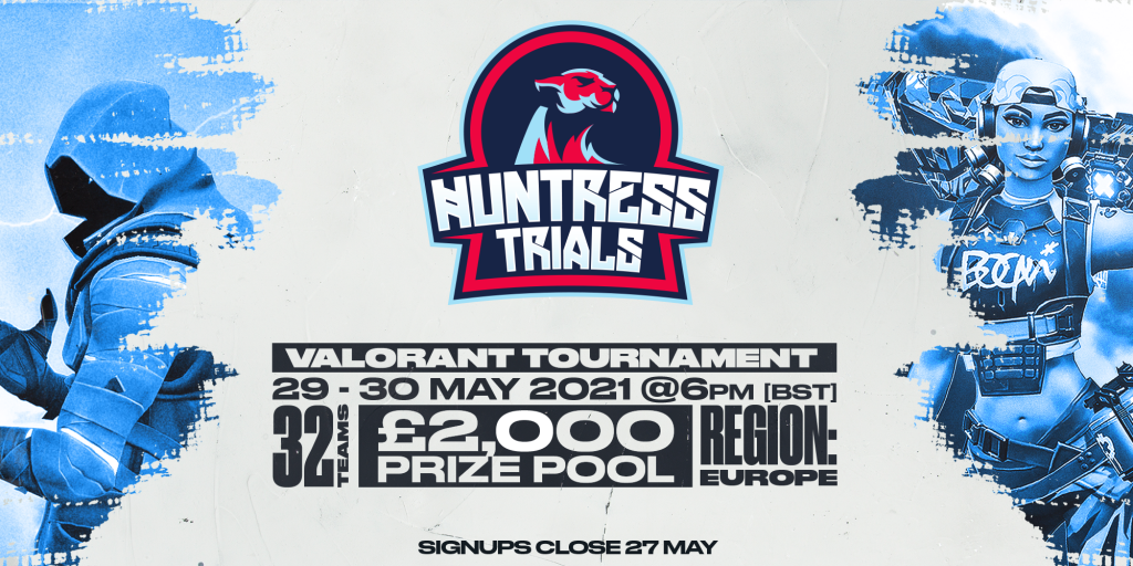 The Huntress Trials May VALORANT EU Open prize pool is £2000.00 GBP total, where the winners of the event will receive £1000.00 GBP, 2nd place £500.00 GBP and 3rd & 4th place will be awarded £250.00 GBP.