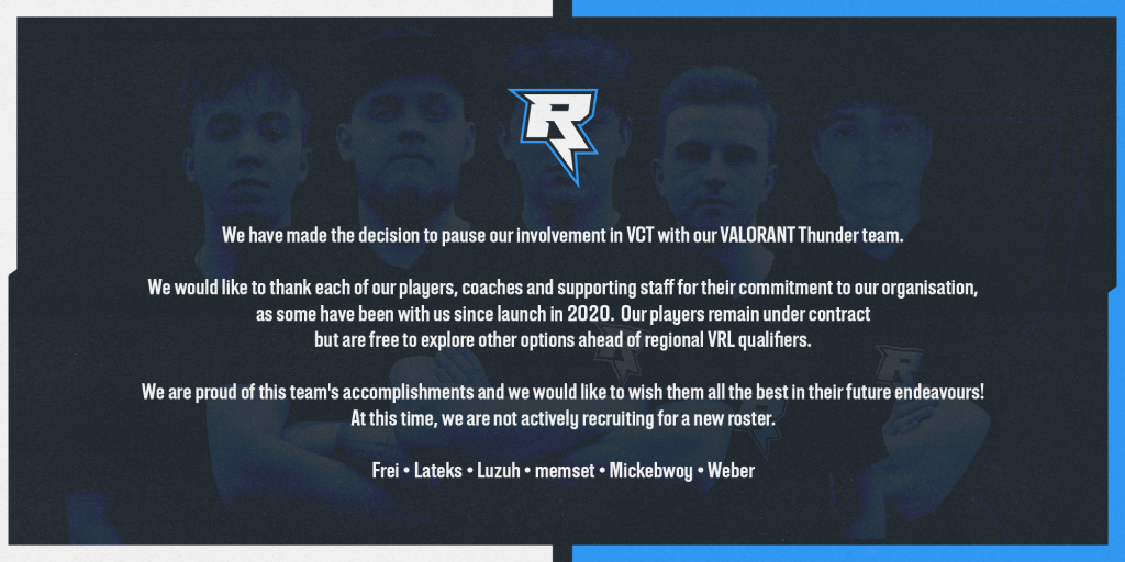 Zack Chandler, Head of Esports, said: “Sometimes the best thing to do is take a step back and evaluate the situation. I’ve had the honour of getting to know each of these players and spending time with them in person, and I’m fortunate enough to see them as friends. I’m incredibly proud of everything this team has accomplished and proved in their time with Rix, however, this makes it even harder to release the team. We will be stepping away from the Valorant Thunder programme for the time being.”